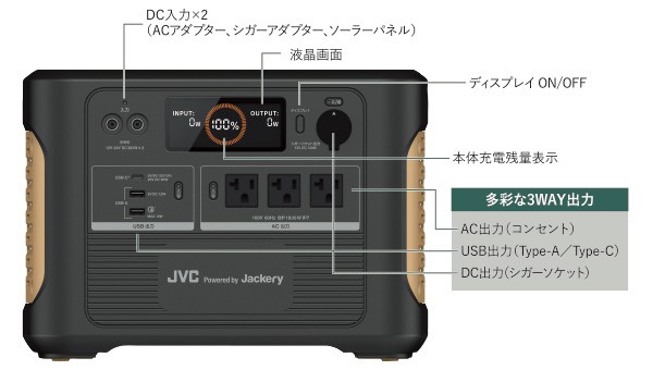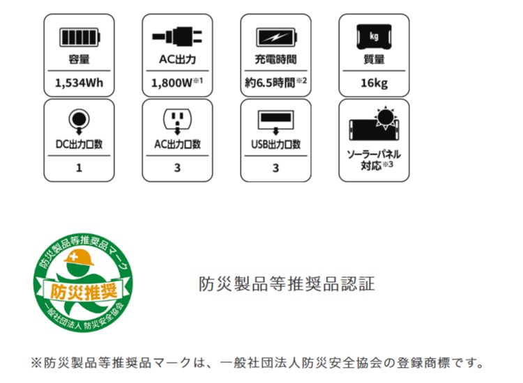 | AC出力 | 3口 100V/18A・60Hz 1,800W(瞬間最大3,600W) |