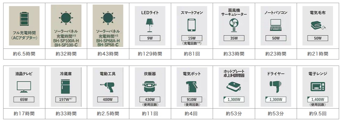 | 充電時間 | 約43時間(ソーラーパネルBH-SP68A-H/BH-SP68-C使用時) |