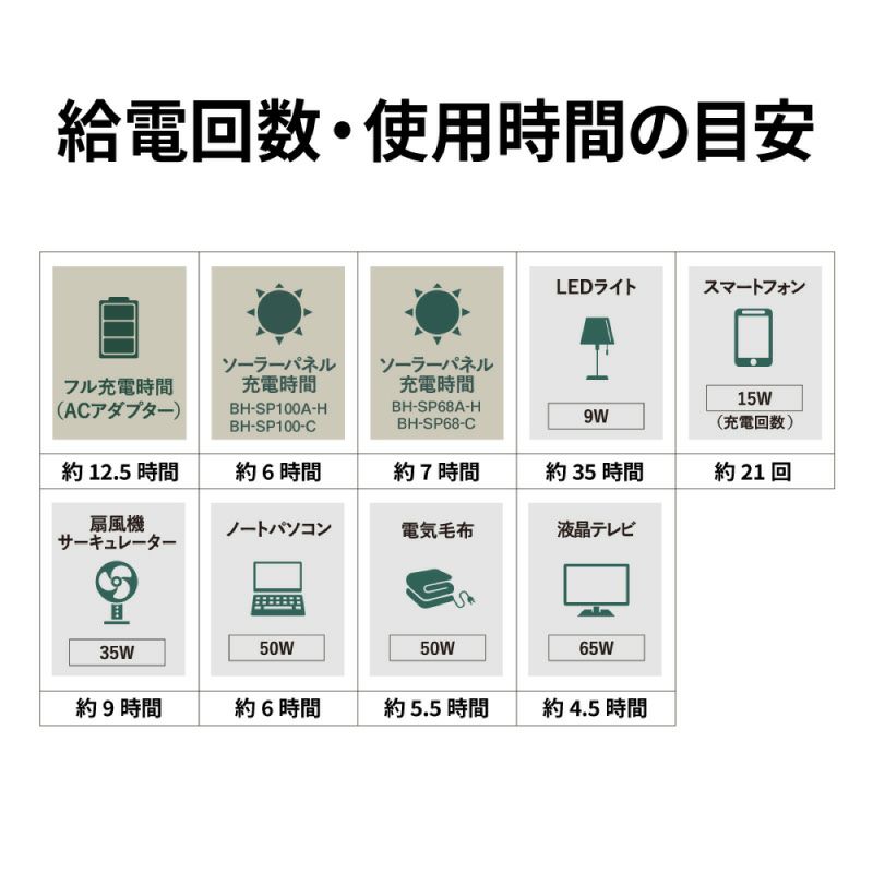 | 充電時間 | 約6時間(ソーラーパネルBH-SP100A-H/BH-SP100-C使用時) |
