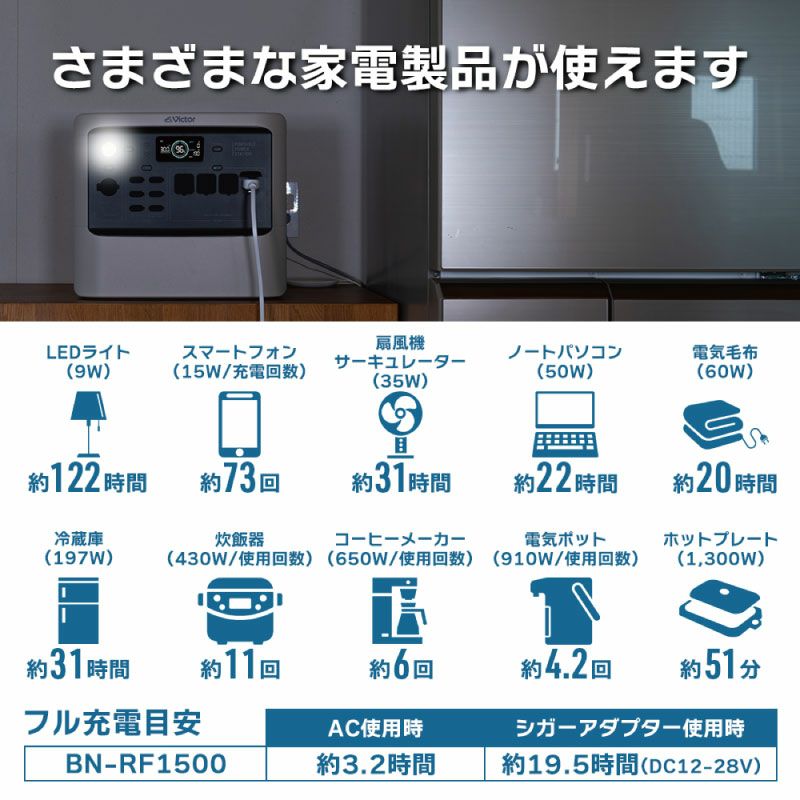 - コンセント・USB・シガーソケットポートを搭載した3WAY電源、出力1,500W(瞬間最大3,000W)のハイパワー設計