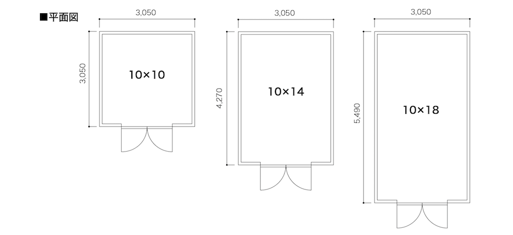 | キットサイズ | 10×10/3050×3050・9.3㎡・2.8坪 10×14/3050×4270・13.0㎡・3.9坪 10×18/3050×5490・16.7㎡・5.1坪 延長キット/4フィート=3050×1220・3.7㎡・1.1坪 | |