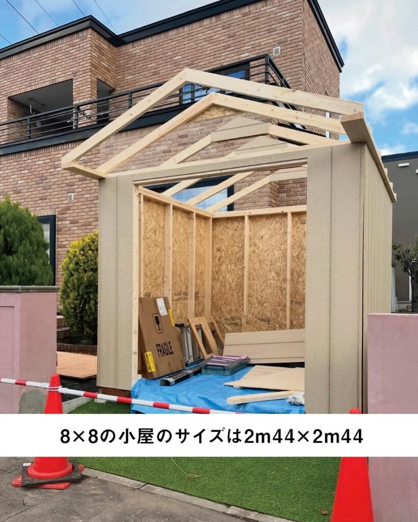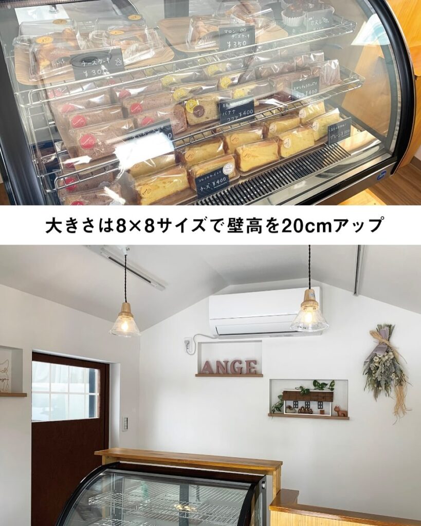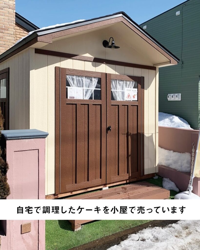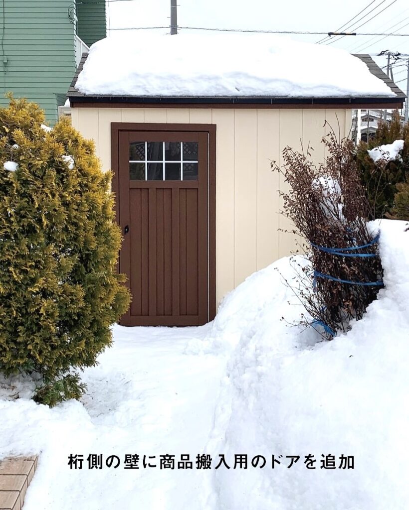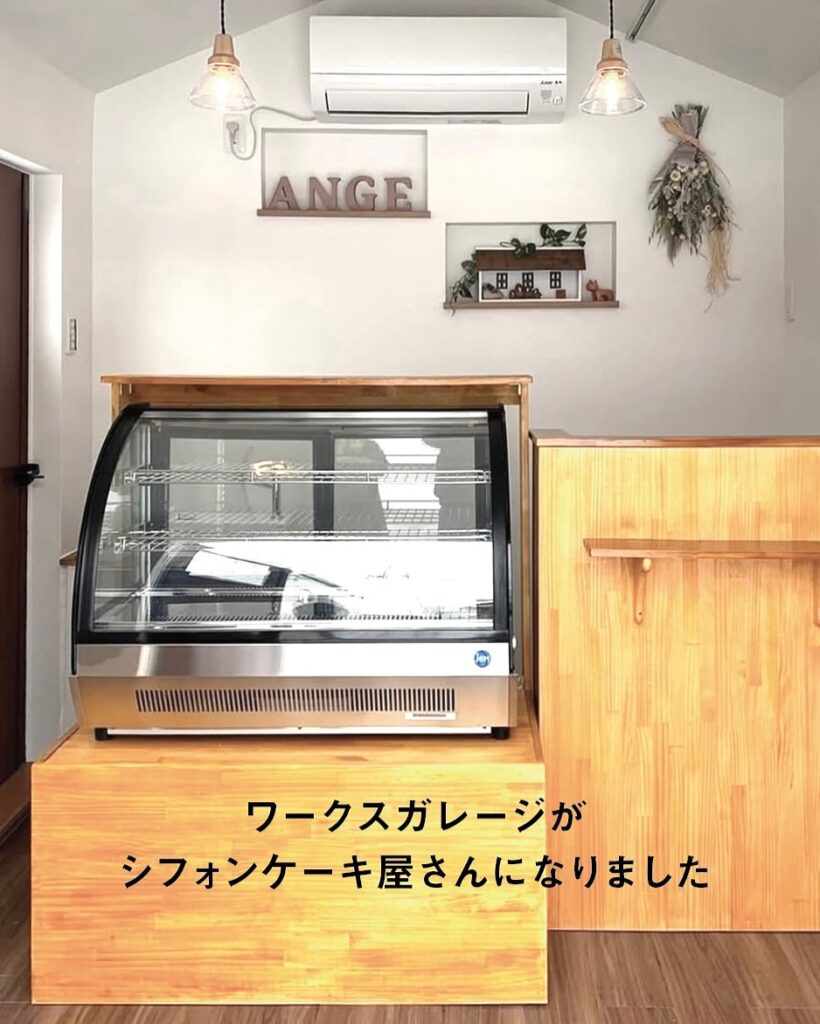 自宅前のスペースにピッタリだったのは、ワークスガレージの8×8サイズ。販売のみなので広さは充分。壁高を20cmアップしているので天井が高いのも気持ちいいですね。桁側には自宅で調理した商品を搬入できるドアを追加で設置。使いやすさがアップしました。