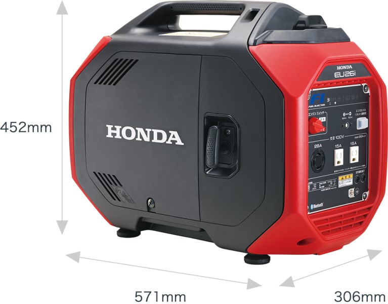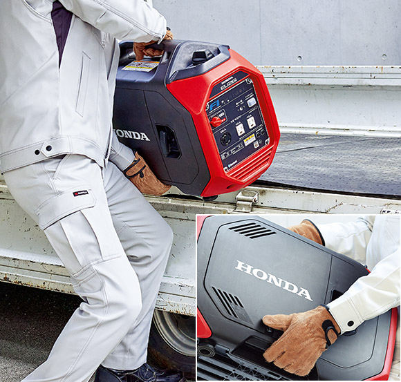 定格出力2.6kVAの発電機ながら26.5kgの重量を実現するとともに、ボディー底部には持ち上げる際に力を入れやすいグリップを配置。一人での積み下ろしも行いやすくなっています。