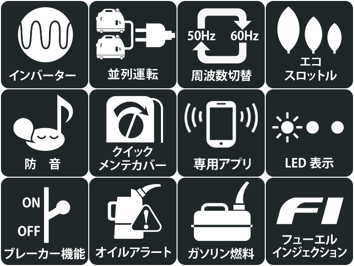2.6kVAの高出力と高い機動性を両立。FI搭載により始動性や保管性も向上。仕事に、非常時に、頼もしさを発揮。