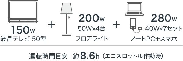 | 連続運転可能時間(h) | 約8.6~ 約3.3(1/4負荷~定格負荷) |