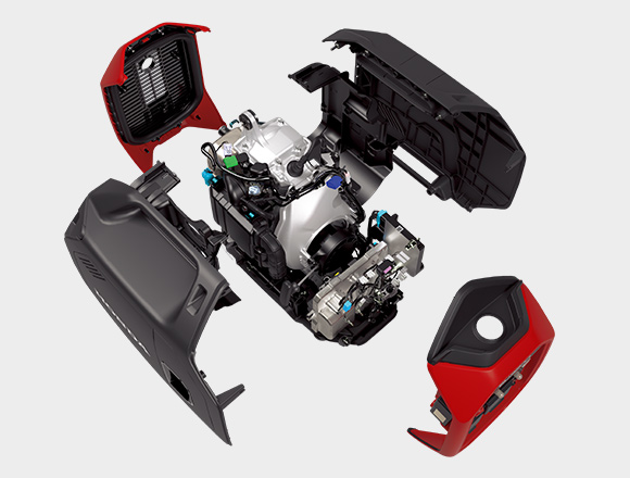 軽量・小型と高出力を両立したエンジンを採用。外装パネルを組み合わせることで高い剛性を確保するモノコック構造を実現。