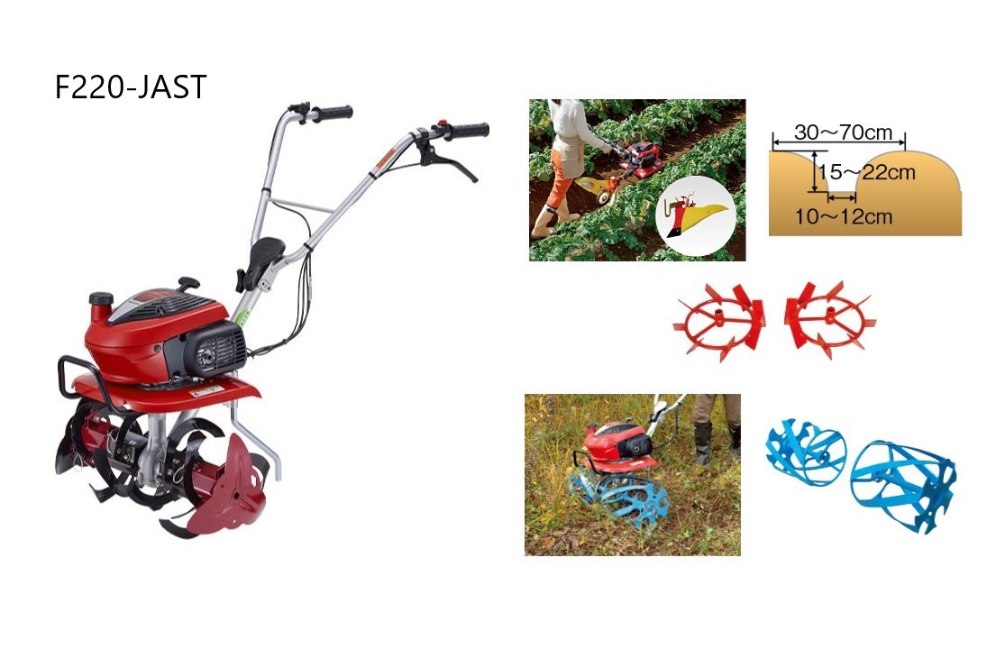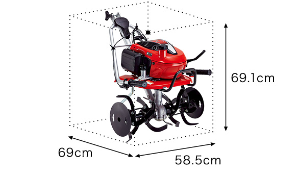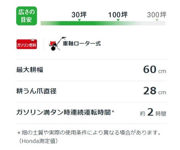 広さの目安100坪(約330㎡)、最大耕幅60cm、耕うん爪直径28cm。ガソリン満タン時連続運転時間約2時間。
