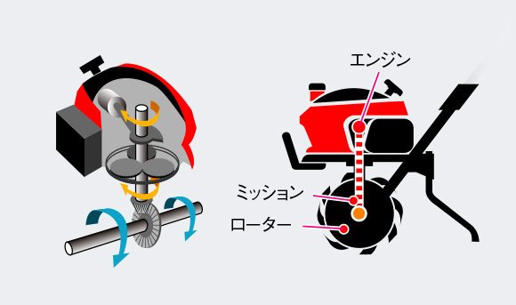 エンジンの下にミッションと耕うん爪を収める“タテ型”のコンパクト設計。