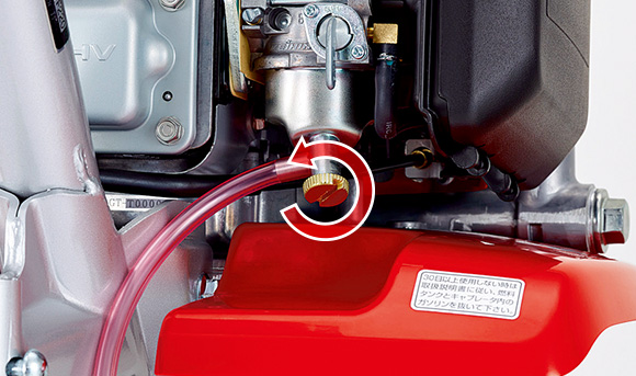 工具を使わずに燃料のガソリンが排出可能。容器に出しやすいよう、ホースも装備。