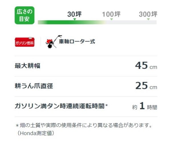 広さの目安30坪(約100㎡)、最大耕幅45cm、耕うん爪直径25cm。ガソリン満タン時連続運転時間約1時間。