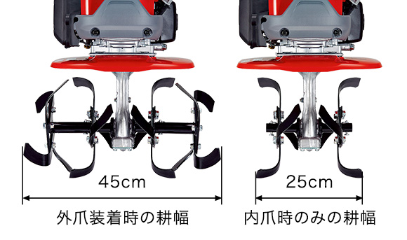 土にしっかり食い込み、上下、左右のブレが少ないプチな専用爪を装備。外爪を取り外せば、中耕培土作業も可能です。