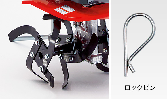 耕うん爪の脱着時、取付方向を気にせずピンを差せる設計のロックピンを採用。