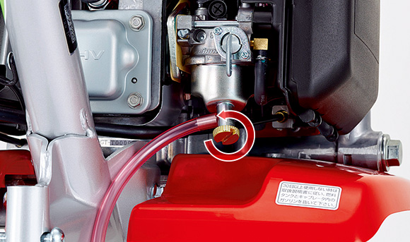 工具を使わずに燃料のガソリンが排出可能。容器に出しやすいよう、ホースも装備。