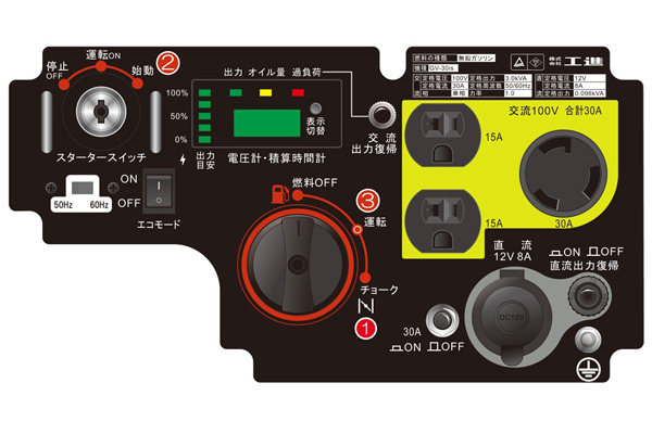 セルモータースイッチの保護ガード付き発電機で、出力電圧がデジタル表示されるとともに、整備時間の目安となる積算時間計が装備されています。