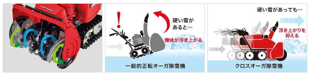 雪を取り込む正転と除雪機の浮き上がりを抑える逆転を同時に行う正逆転オーガ機構。