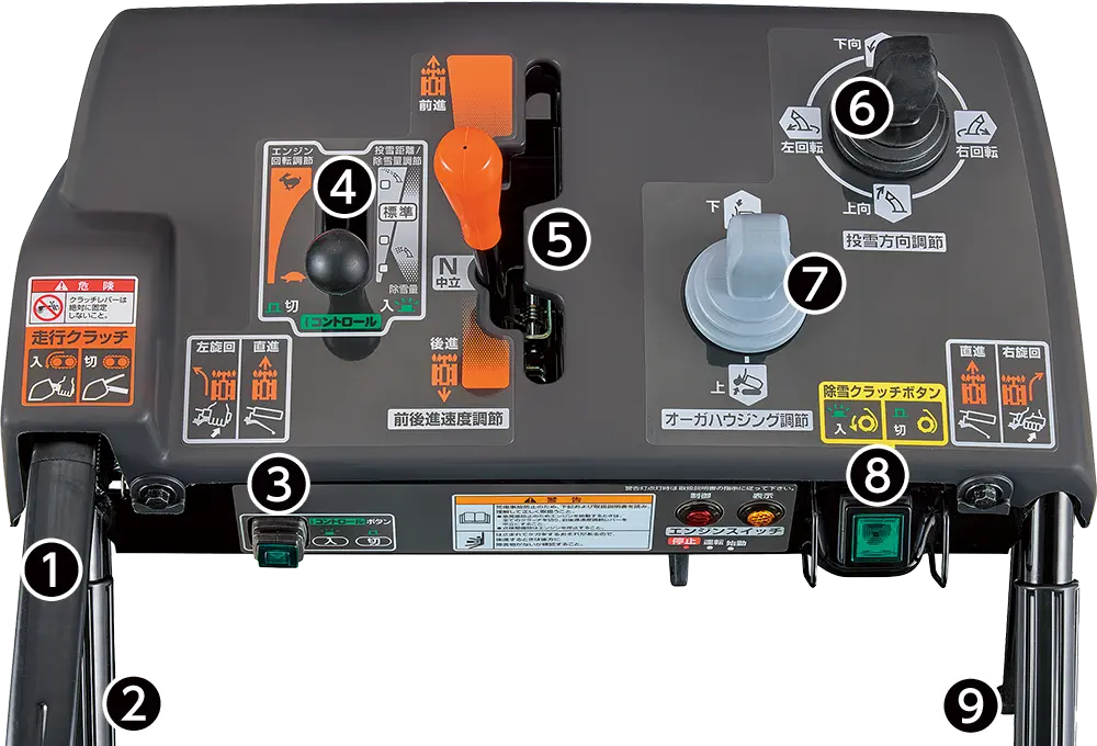⑥投雪方向調節スイッチ ⑦オーガハウジング調節スイッチ ⑧除雪クラッチボタン ⑨右旋回レバー
