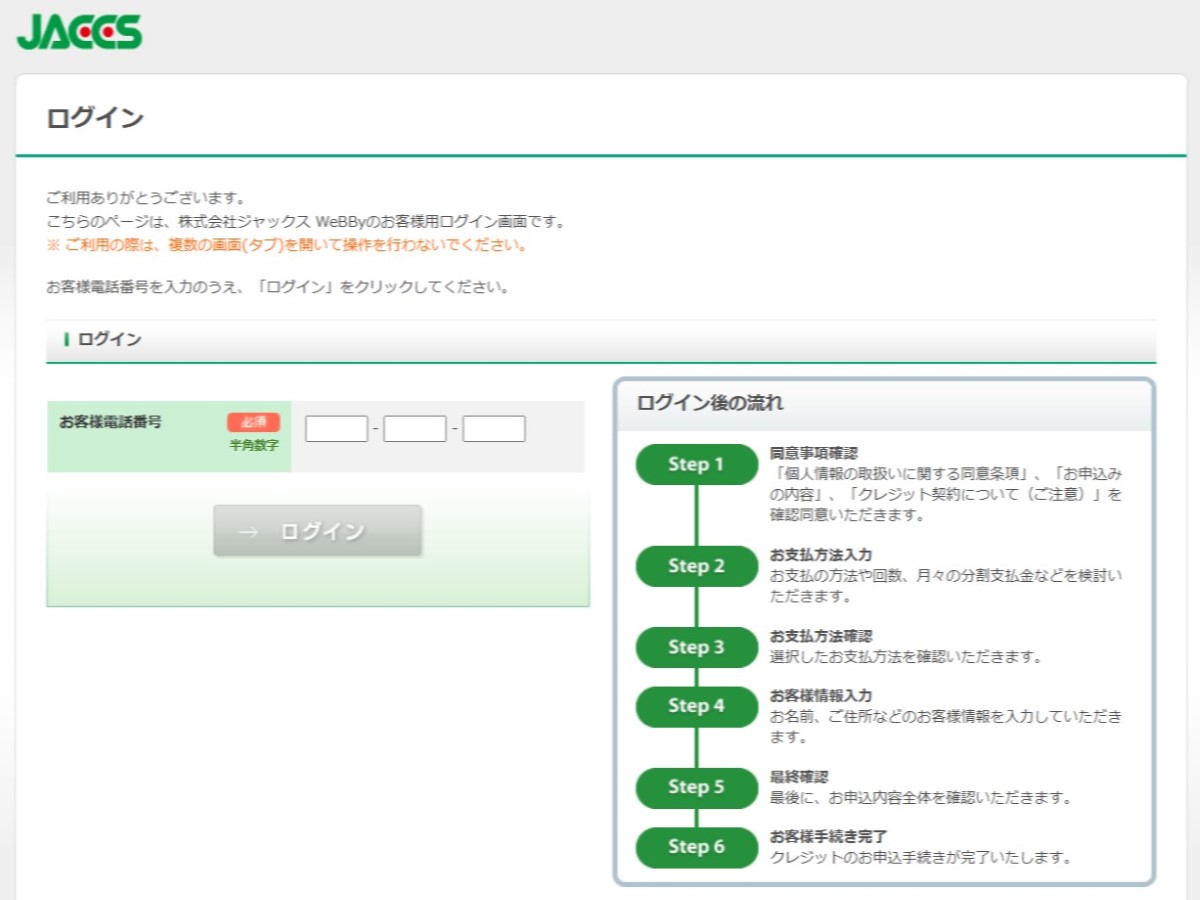 ・ジャックスのサイトにて、お客様の電話番号でログイン後、クレジット申し込み内容およびお客様情報をご入力ください。 - 審査・契約