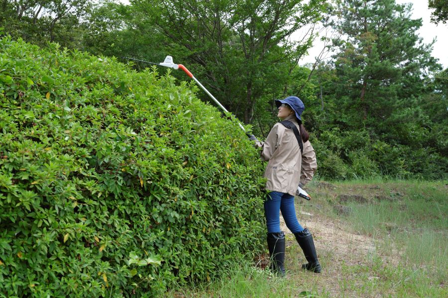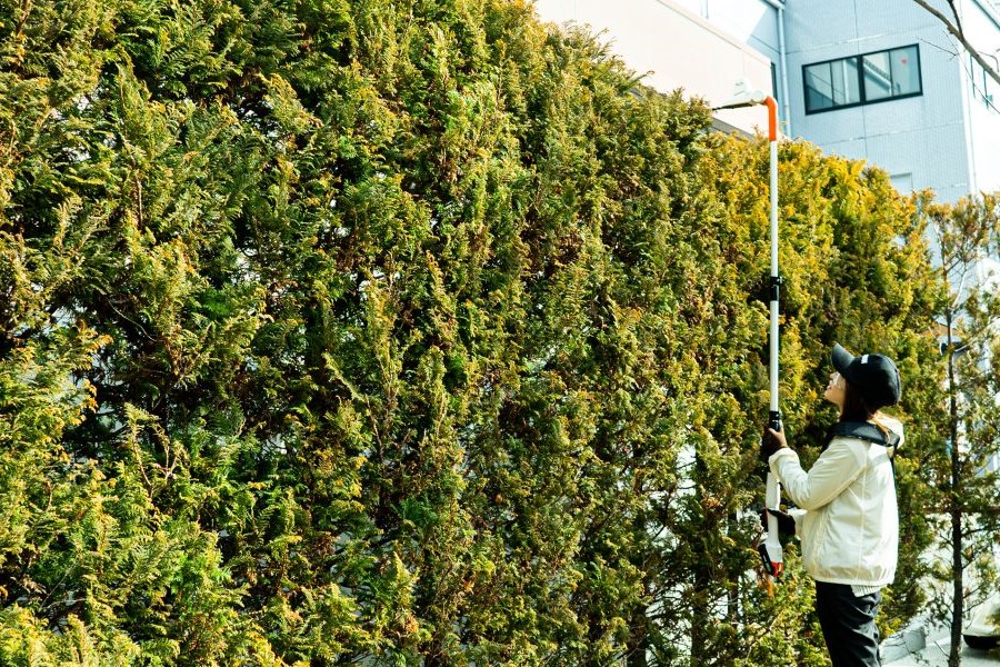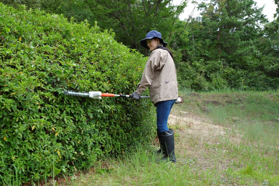 軽快に高所も楽々剪定、三面刃でサクサク切れる。