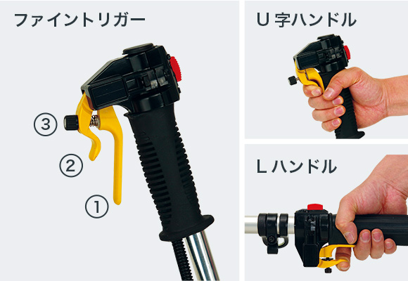 スロットル調整ノブを調節することで、作業に適した刈刃速度に設定できます。 - 握りやすいグリップ形状