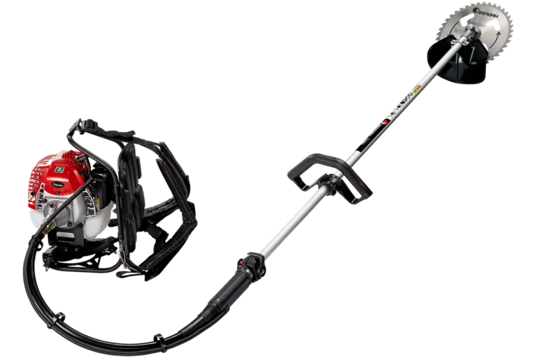 ループハンドルで、斜面や狭い場所での作業にも強い。背負式、チップソー仕様。
